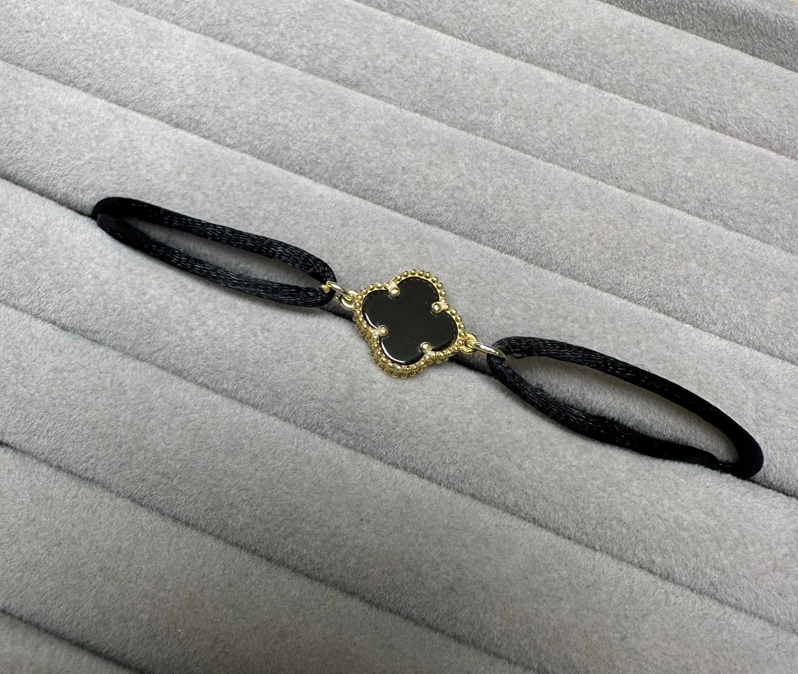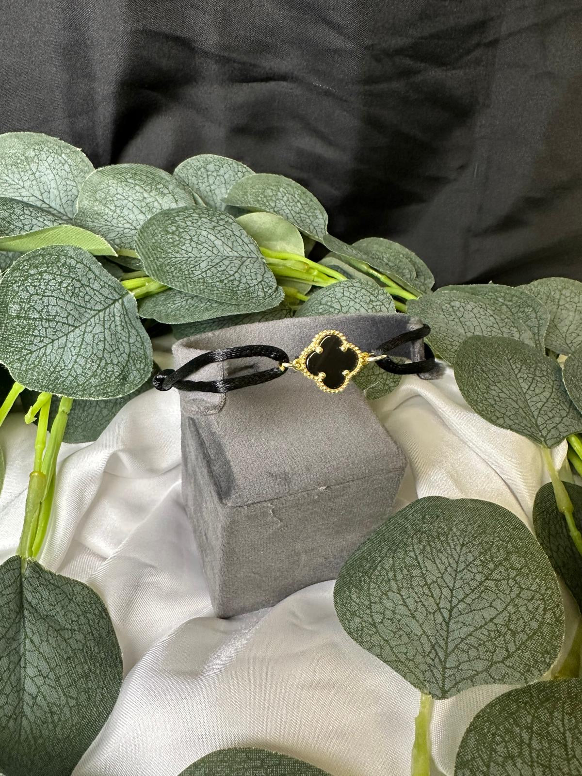 1. Anhänger: Der zentrale Anhänger ist ein stilisiertes vierblättriges schwarzes Kleeblatt . Der Rand ist goldfarben mit einer perlenartigen Struktur, die dem Design eine hochwertige Optik verleiht.