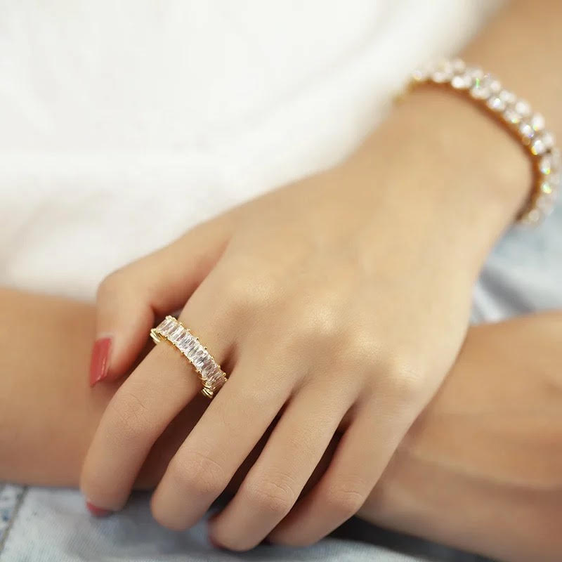 Die ästhetisch gearbeiteten Facetten in harmonischer Kombination aus Baguette Steinen spiegeln das Licht wie Eis & bewirken einen flammenden Regenbogen- Effekt. Mit dem Ring wirst du die inspirierende Wirkung auf dich & dein Umfeld spüren.